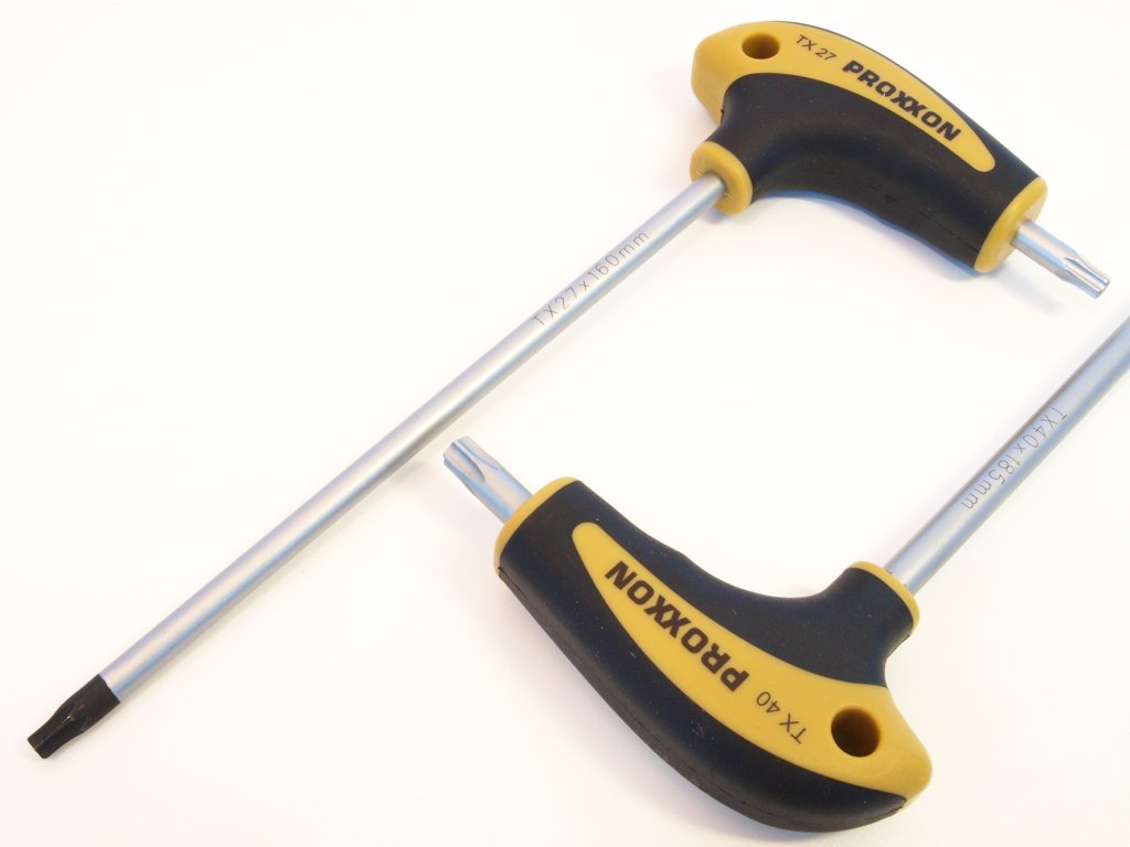 Šroubováky Proxxon s L-rukojetí jsou vyrobeny s průchozím dříkem, tzn. že dřík je ve tvaru "L" v jednom kuse, nehrozí tak vylomení z rukojeti jako u levných šroubováků tohoto typu. Díky ergonomické rukojeti ve tvaru "L" jsou tyto šroubováky ideálním řešením při povolování a utahování např. zarezlých nebo lepených šroubů. Kroutící moment je vyšší než u klasického šroubováku. Ergonomická a asymetrická rukojeť tak umožňuje dlouhodobou práci a zabraňuje tvorbě otlaků i při vyvinutí max. síly. Zřetelné značení velikostí pomocí laseru na dříku i rukojeti. Šroubováky s L-rukojetí jsou určené pro profesionální použití v každé dílně a na dlouhohodinové montáže. Přesně opracovaný konec šroubováku s TORX klíčem je vyroben z kvalitní chrom-křemík-manganmolybdenové oceli s matným pochromováním a na dříku je zřetelně laserem označena velikost. Rukojeť je vyrobena ze speciální pryže, která je odolná vůči olejům a běžným kyselinám používaným v automobilovém průmyslu. V horní části rukojeti je otvor pro zavěšení na hák.